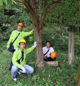 平成30年に記念植樹した木と記念撮影(左から鈴木 誉人常務理事、高谷 厚之筆頭副理事長、田辺 哲支部長、呉 尚秀副支部長、的場 真弘副支部長)