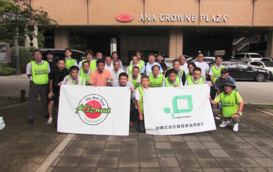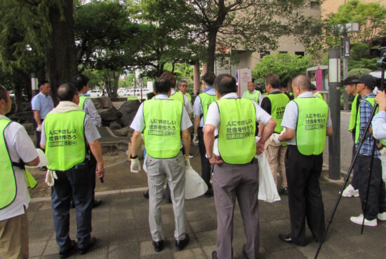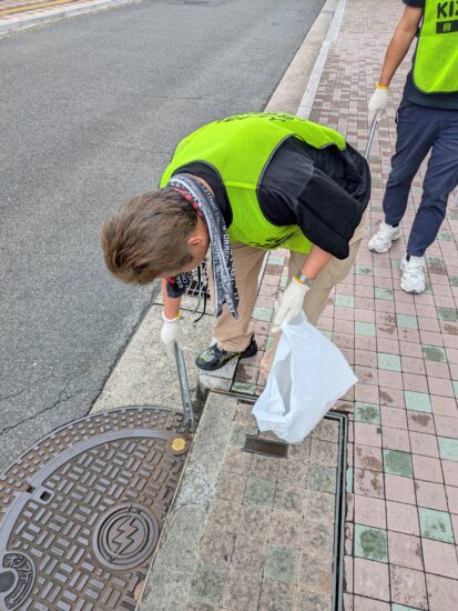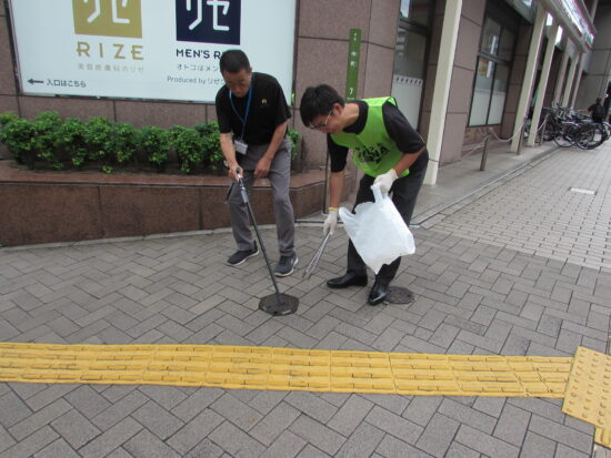 当日は時折雨がパラパラと降る不安定な天候でしたが、参加者は当組合から支給されたビブスや腕章を着け、約30分かけて精力的に清掃活動を行いました。