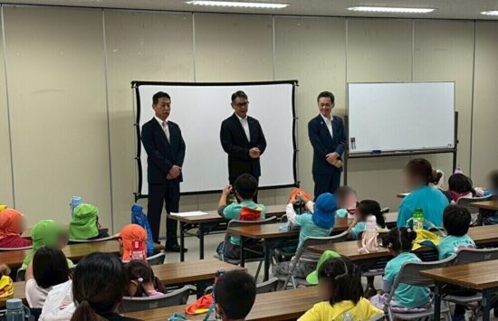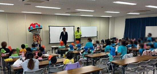 当日、参加者はセンター会議室に集まり、司会の長嶺 将光副支部長が進行し、まず沖縄パチンコ・スロット協同組合イメージキャラクターの玉三郎が登場しました。会場に姿を見せると、園児たちから大きな歓声が上がり、笑顔と拍手で迎えられました。その後の開会挨拶では、森山 正秀支部長が「九州・沖縄支部では、18年前に環境保全活動の一環として、成田事務局長にご協力いただきサンゴの植付けを始めました。園児たちには、今回の講習でサンゴも命を持った生き物だと感じていただき、すべての命を大切にするという教育の学びの場になれば良いと思っています。今回は組合員だけでなく、沖縄パチンコ・スロット協同組合様、九州遊技機商業協同組合様にもご参加いただき御礼を申し上げます。本日はよろしくお願いいたします」と活動の意義と関係者への感謝を述べました。続いて、沖縄パチンコ・スロット協同組合の新垣 善彦理事長より「サンゴについて勉強する良い機会になりますので、是非、一生懸命、話を聞いてください。また、この後は食事を用意していますので楽しみに待っていてください。本日はよろしくお願いいたします」とご挨拶をいただきました。